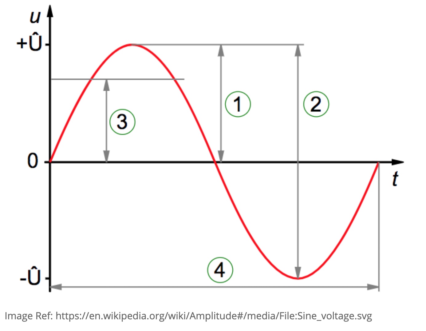 Amplitude of an RF signal is the measure of change of the electric field of the EM wave in time. In the picture, (1) is the peak amplitude, (2) is the peak-to-peak amplitude, (3) is the RMS (root mean square) amplitude, and (4) is the wavelength.