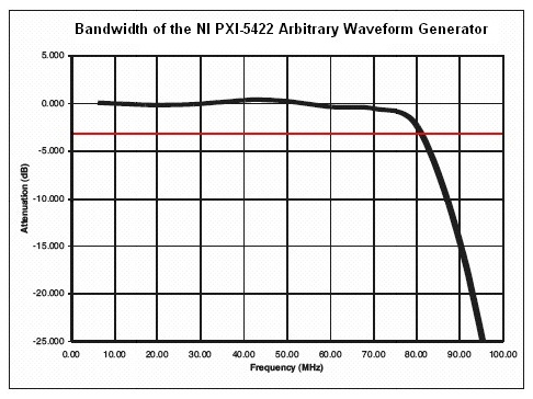 The bandwidth of a signal generator is the frequency at which the output signal is attenuated 3 dB relative to the amplitude of a DC or low frequency signal. The picture below shows a function generator with bandwidth of 80 Mhz.