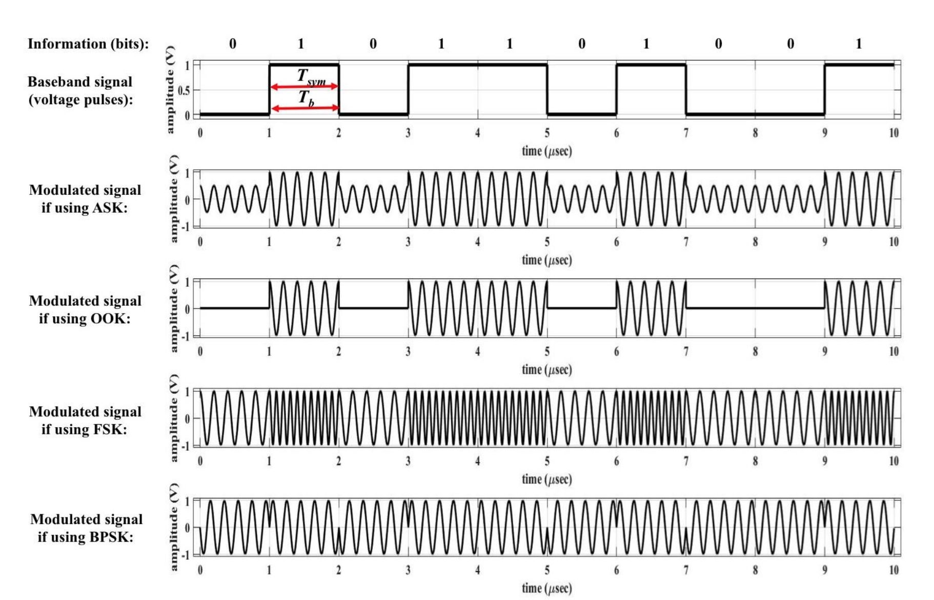 In binary digital modulation, there are two symbols and each carries 1 bit of information. Just as we can vary amplitude, frequency or phase of a high-frequency carrier in accordance with an analog information (message) waveform, we can do the same with digital waveform. Since bits vary between 0 and 1, digital modulation techniques that vary the carrier's amplitude, frequency or phase are referred to as "shift keying".