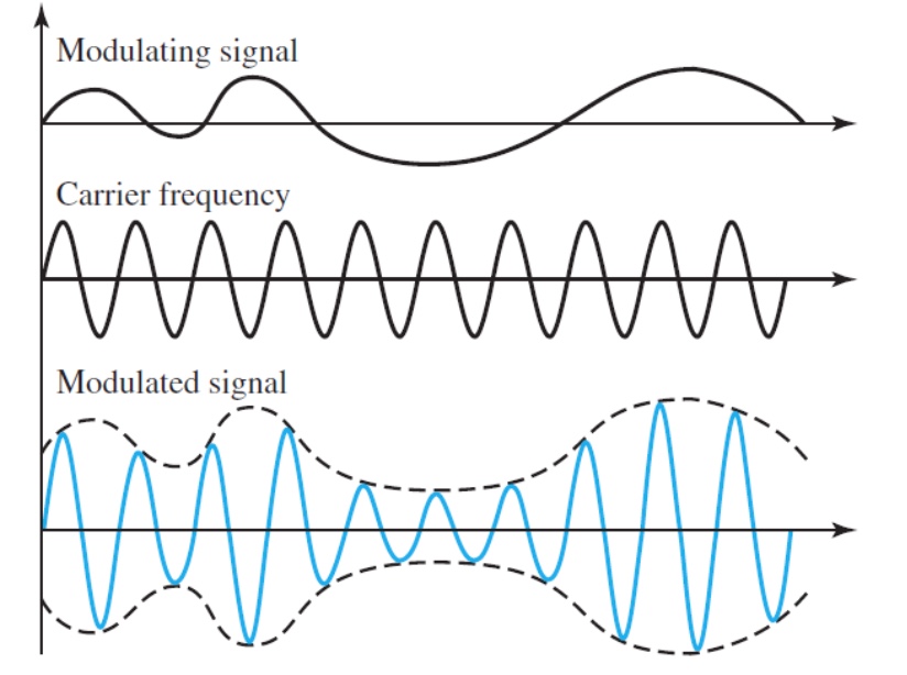 In order for EM waves to transmit information, they have to modify the amplitude, frequency and phase characteristics of the wave to encode the information in it. This process is called moduleation and is done by mixing a modulating signal, which contains the information to be transmitted, into a periodic carrier waveform (CW), which propagates the signal through the environment.