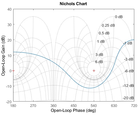 A Nichols chart displays the magnitude (in dB) plotted against the phase (in degrees) of the system response.