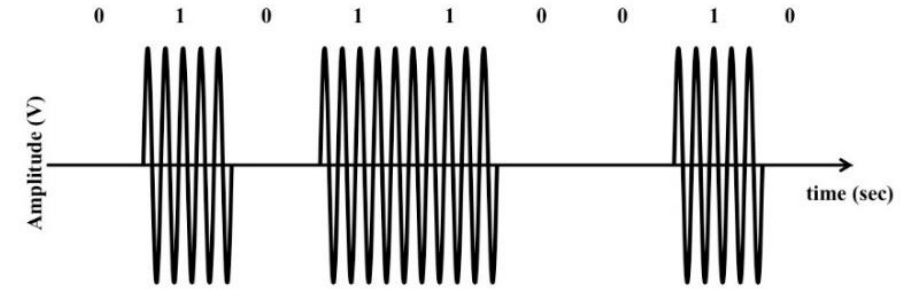 The simplest ASK modulation scheme is On-Off Keying (OOK), in which a carrier wave is transmitted for 1 and nothing is transmitted for 0.