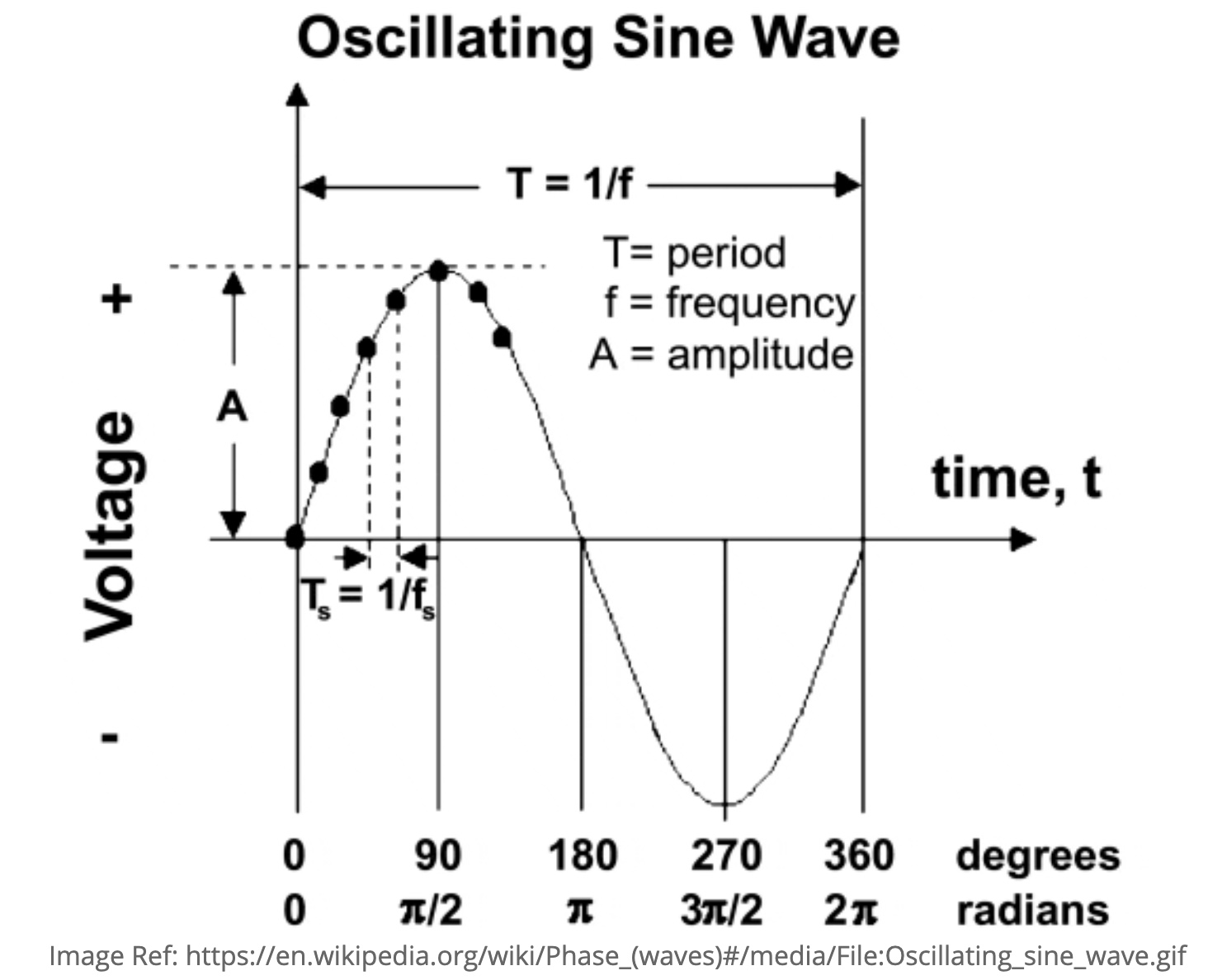 The phase of an RF wave is the offset of where the wave starts expressed in radians. A wave that is offset by 2 PI (180 degrees) has the opposite waveform compared to the original wave with 0 phase.