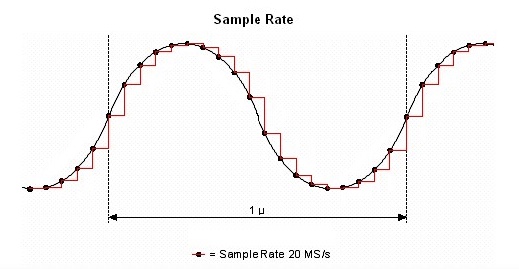 A digital waveform must be updated at least twice as fast as the highest frequency (Nyquist frequency) of the desired signal to be accurately generated. Ideally, though, a sample rate many times greater than the signal’s highest frequency produces accurate waveforms. A higher sample rate also captures more waveform details.