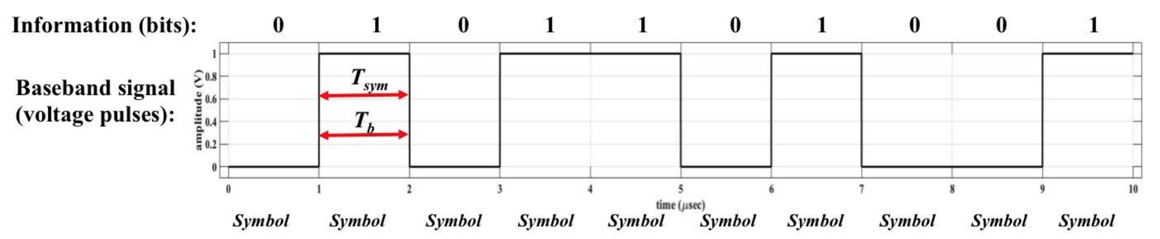 Digital modulation was invented as a way to transmit digital information (0s and 1s) over a carrier wave. To achieve this, discrete RF energy states are used to represent some quantity of the digital information. These states (usually 0 or 1 bits) are transmitted in the form of waveforms that represent the bits. These waveforms are usually referred to as "symbols". In the image below, there are 10 bits transmitted and they are carried in the 10 symbols.