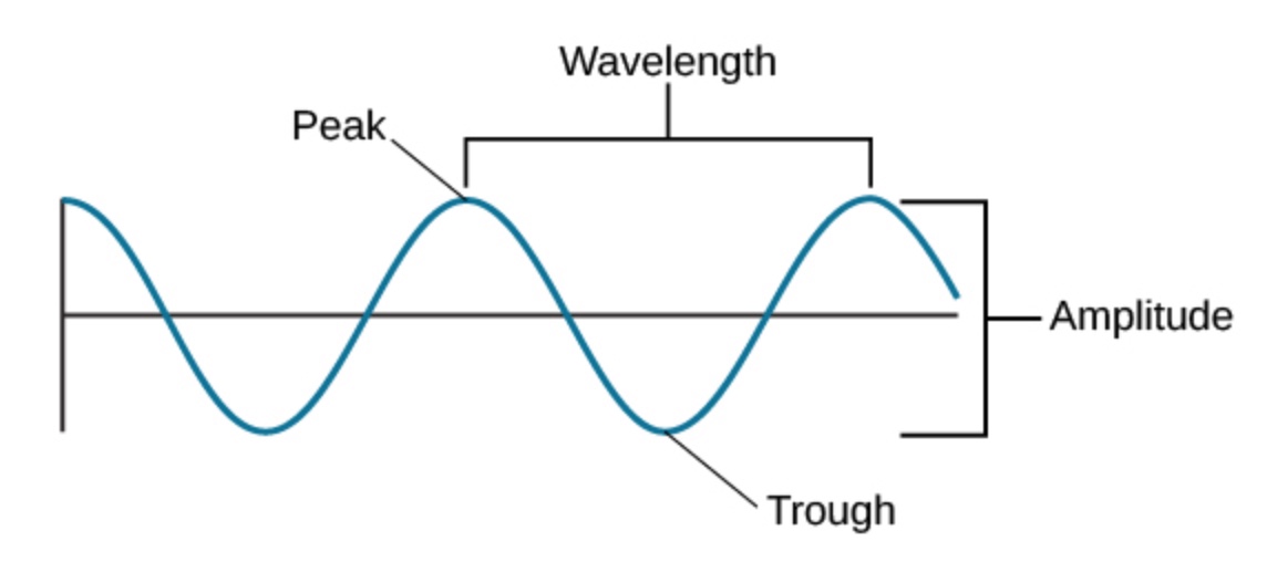 This picture describes basic properties of an EM wave (or any other wave). Amplitude is the height of the wave, wavelength is the peak to peak distance, the highest point is peak, the lowest is through.